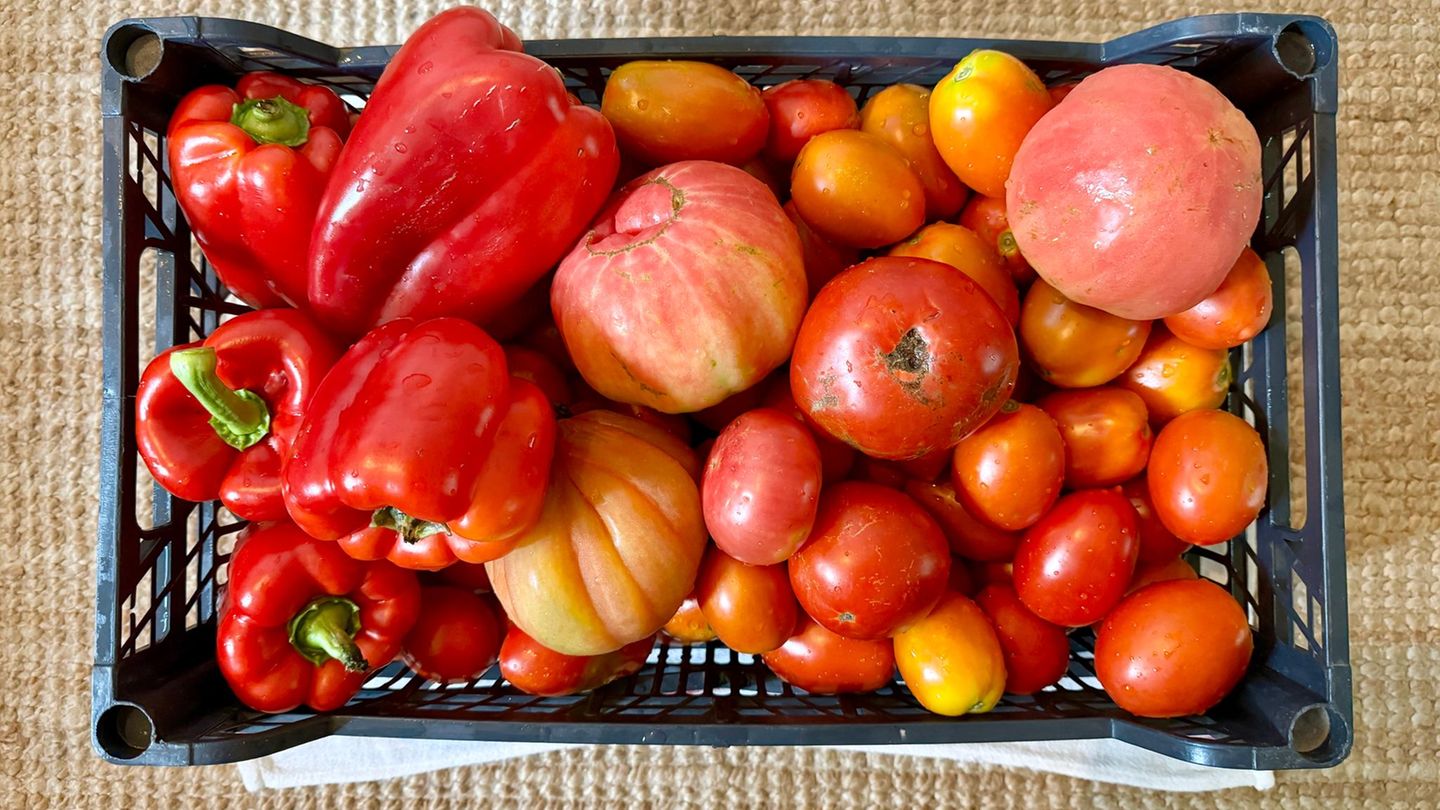10 kg reife Tomaten, verschiedene Sorten6 Paprika150 g Salz