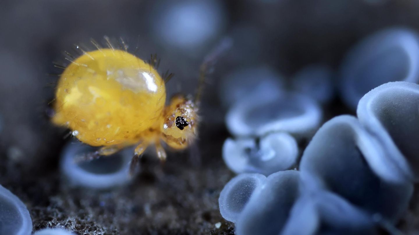 Als die Welt während der Corona-Pandemie zusammenschnurrte, eröffnete sich Marco Colombo eine große Welt im Kleinen. Der italienische Fotograf begab sich in seinem Garten auf Safari, nahm Erdkrumen, Mooskissen und welkes Laub unter die Lupe. Denn die Tiere, die er suchte, messen zwischen einem Viertelmillimeter und einem knappen Zentimeter. Und sie sind äußerst sprunghaft. Ein Luftzug, eine abrupte Bewegung, und die Winzlinge katapultieren sich aus der Gefahrenzone.
